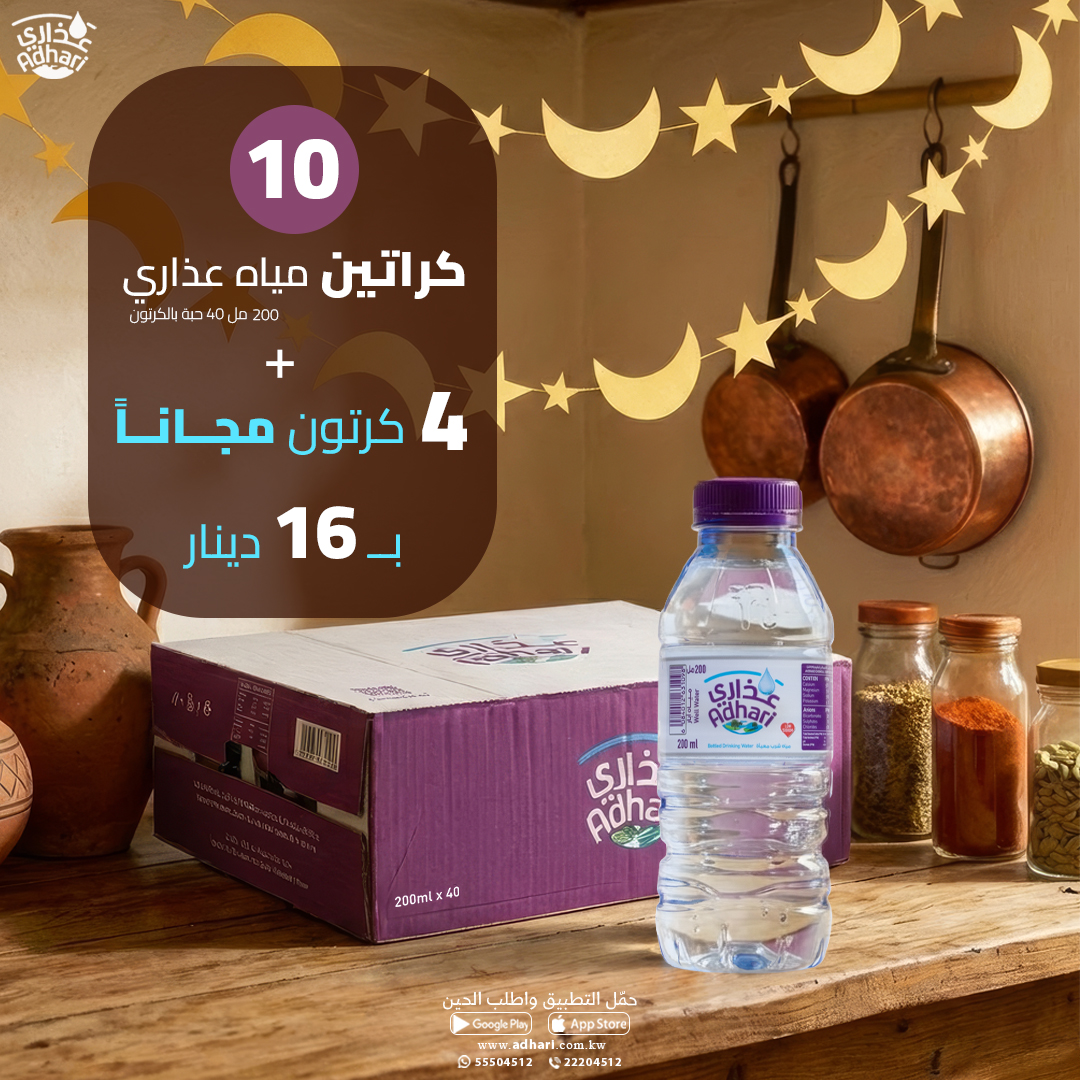 10 كرتون مياه عذاري 200 مل شد40 + 4 كرتون مجانا pt